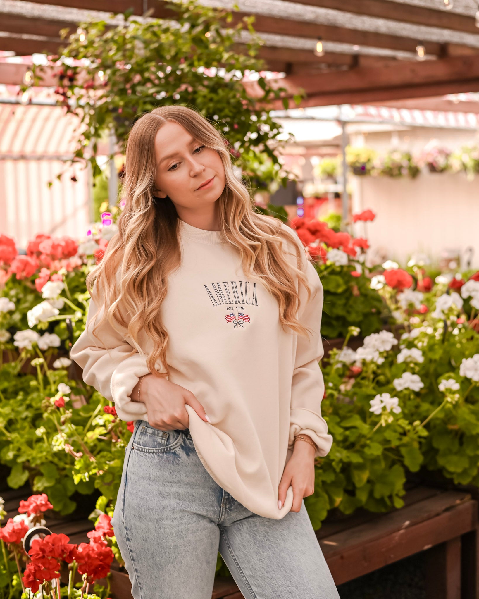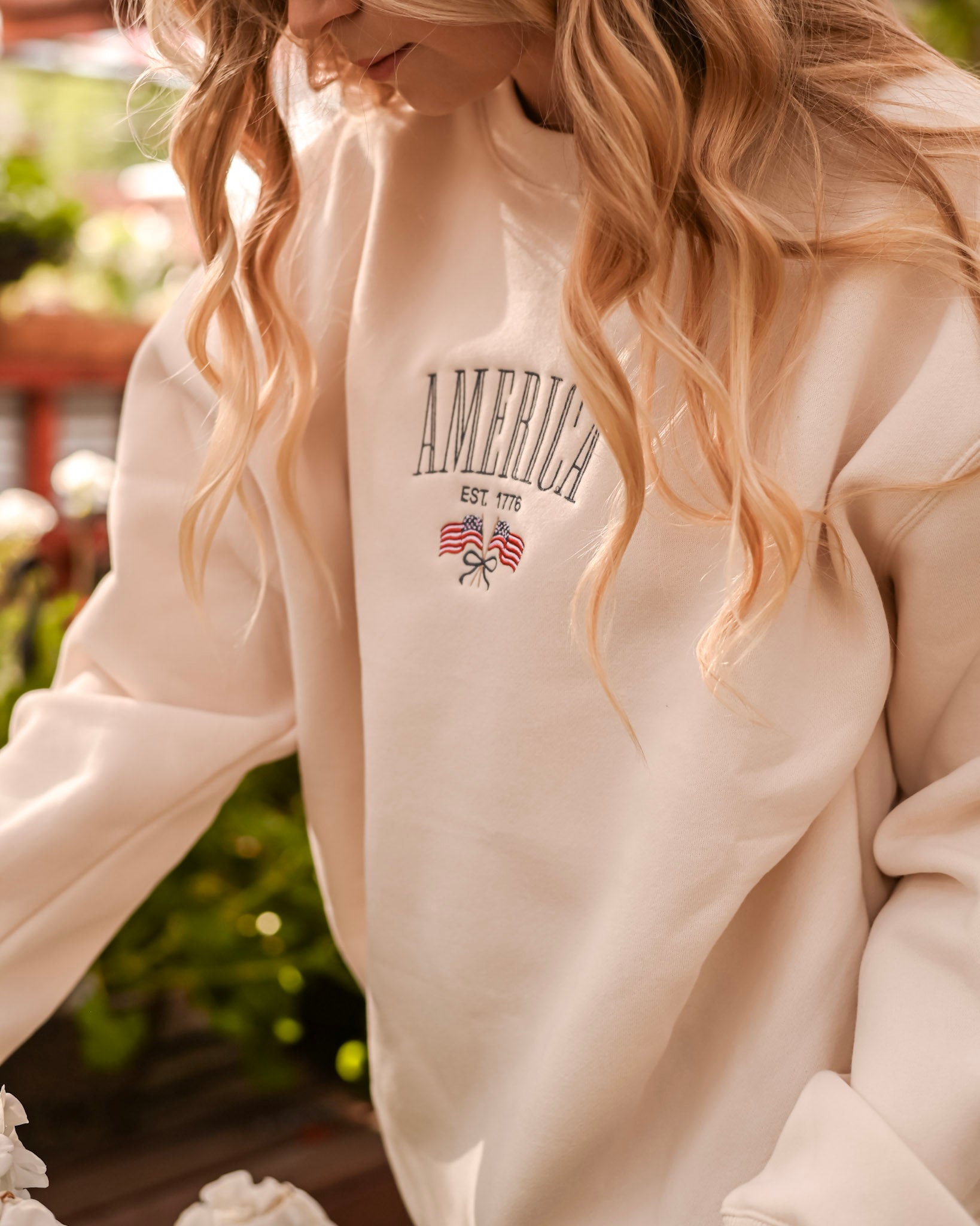 The perfect crew for summer nights! Made on our Share Studio Ultra Fleece Crew, these embroidered America Crews are the coziest thing you'll wear all year. These are an oversized fit - yet tailored in all the right places. Model in photos is wearing a medium.