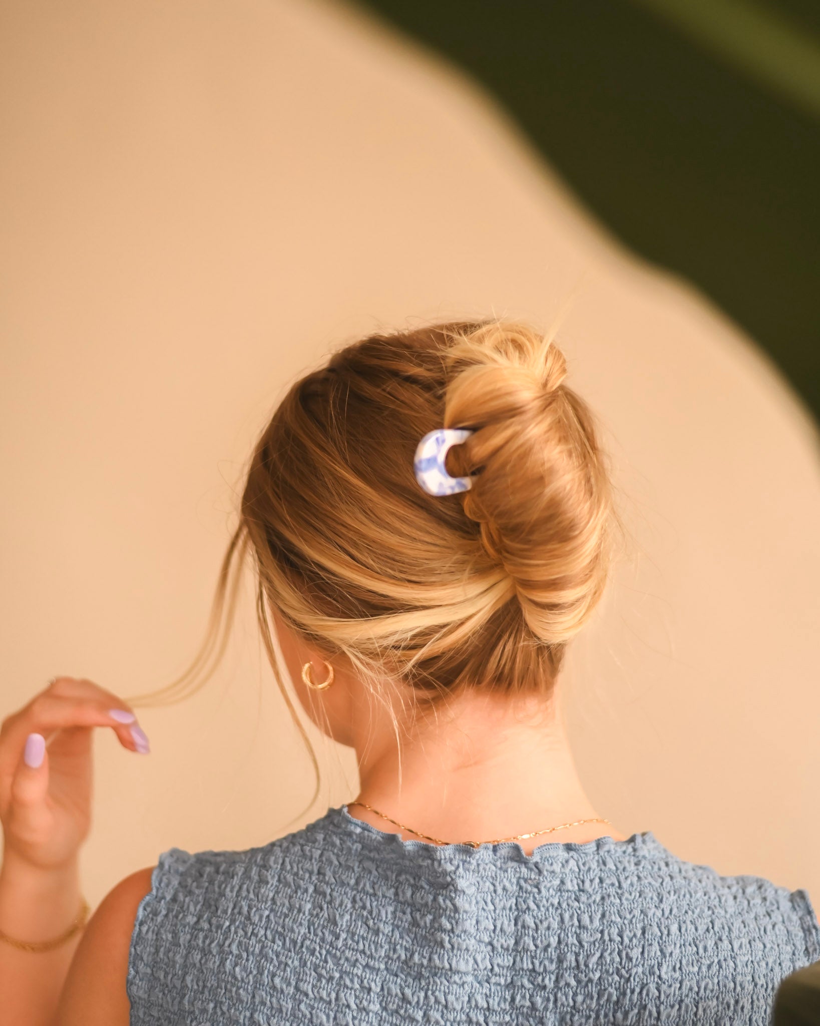 This hair pin features a playful blue toile print, perfect for adding a touch of fun to any hairstyle. Made with cellulose acetate, it's both durable and stylish. Upgrade your hair game with this elevated accessory.
