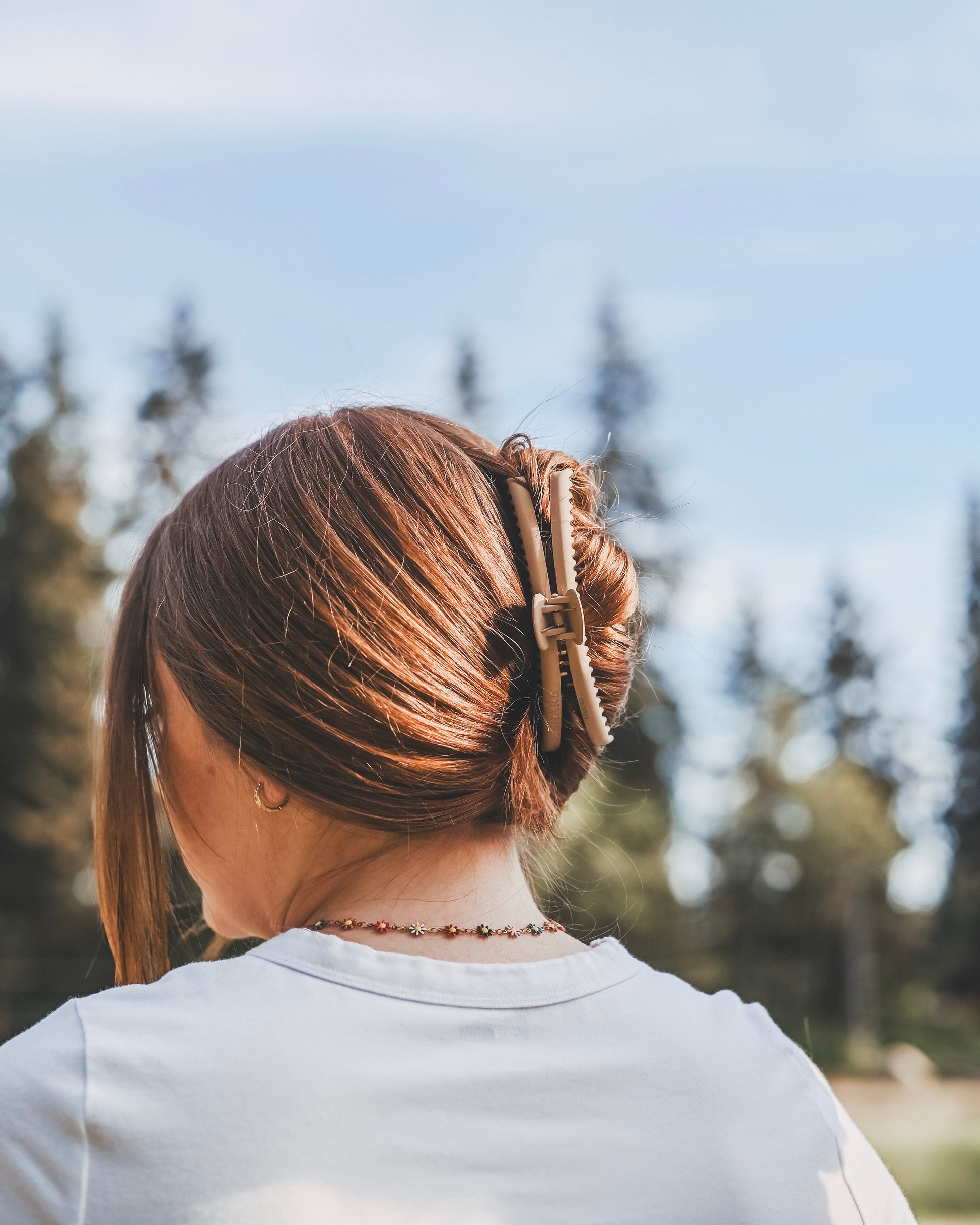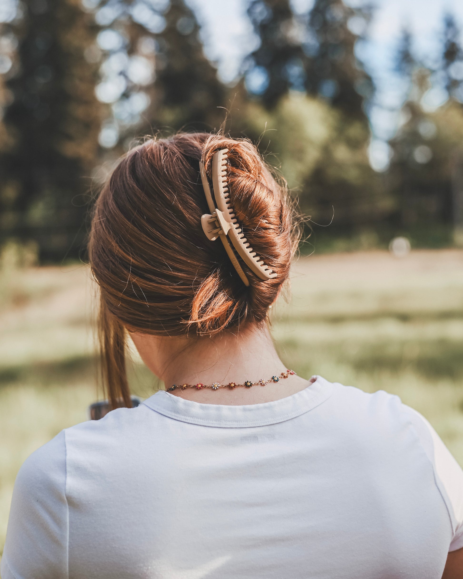 The Mega Hold Clip is a great go-to clip for every hair type, and works wonders at keeping hair in place all day long without causing damage. The structure and design of the Mega Hold allows for a comfortable fit through any activity, including laying down and driving! This clip is especially great for active occupations and hobbies. Our Brandy Tan Mega Hold is a light tan with neutral undertones and a matte finish.