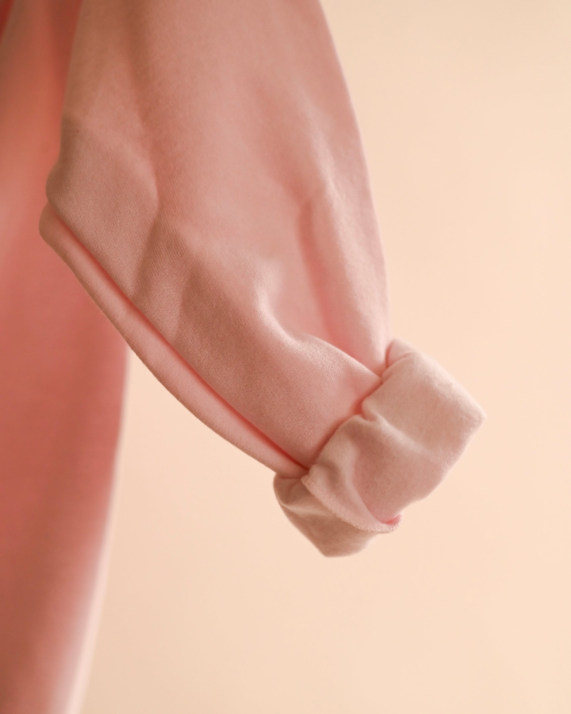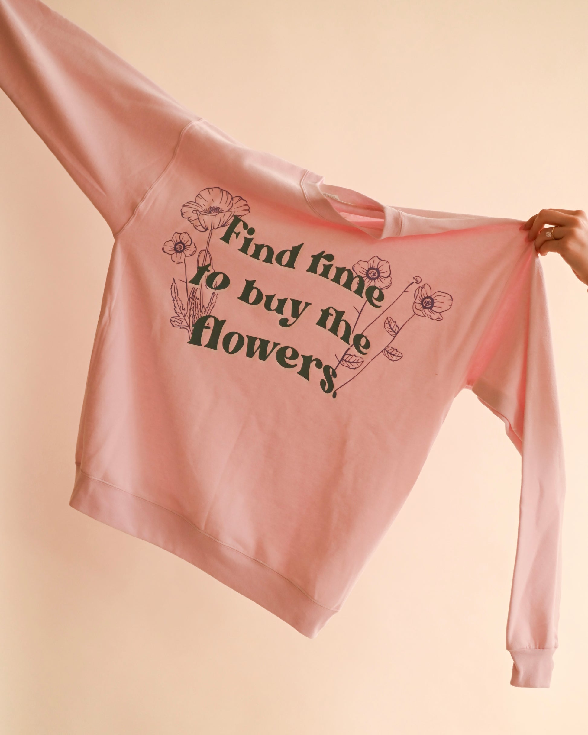 Light pink mid weight fleece crewneck with printed “take time to buy the flowers” design on front.