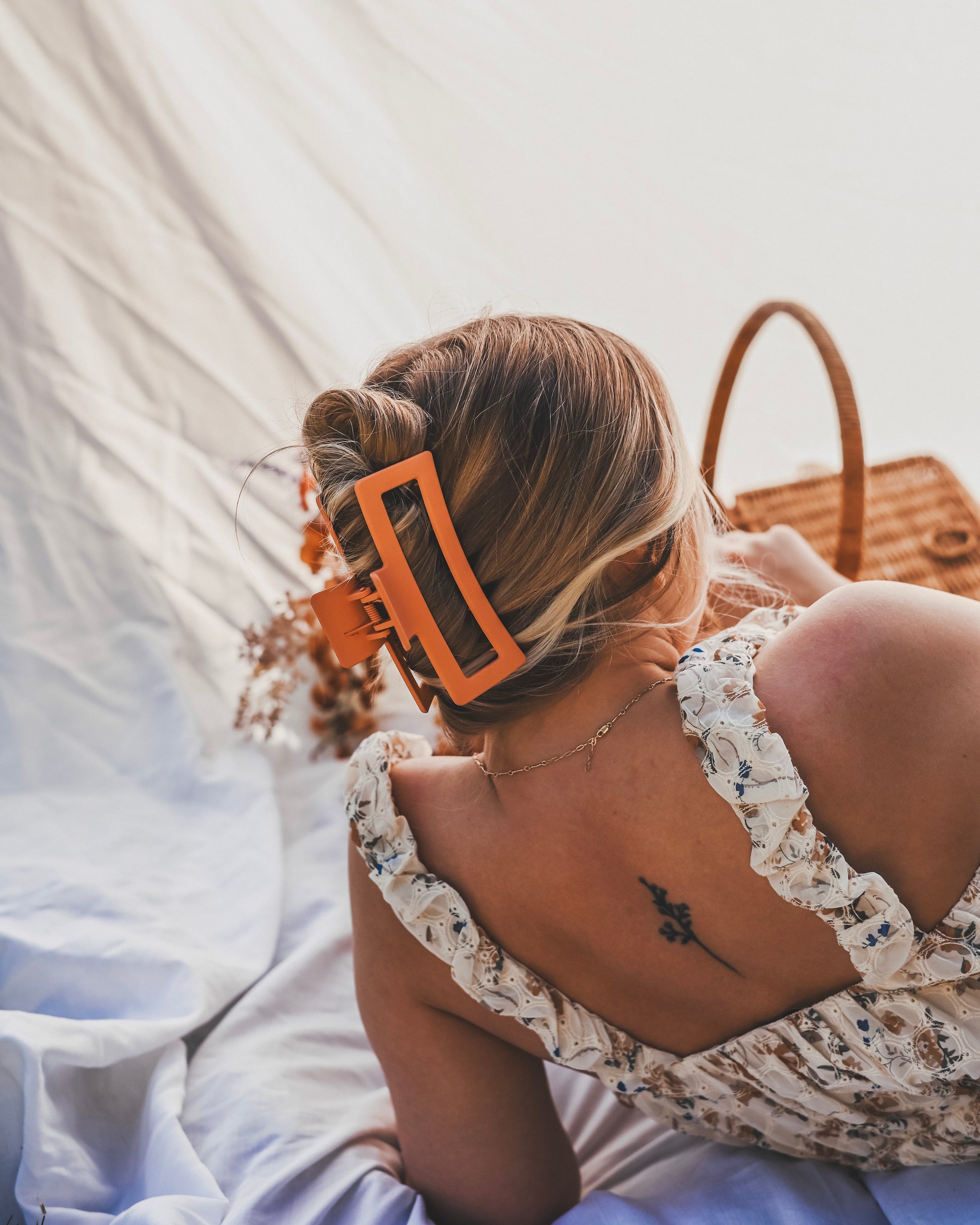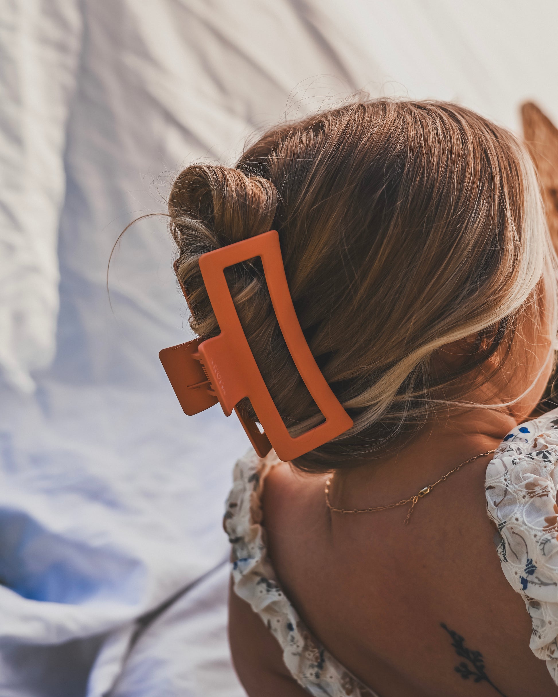 Our infamous Jumbo Claw Clip in a brand new color! This bright matte, coral orange color is the perfect shade to brighten up your look this summer. This clip is perfect for thick hair, measuring approximately 5 inches long with an extra strong spring to ensure a lasting grip for all of your luscious locks!