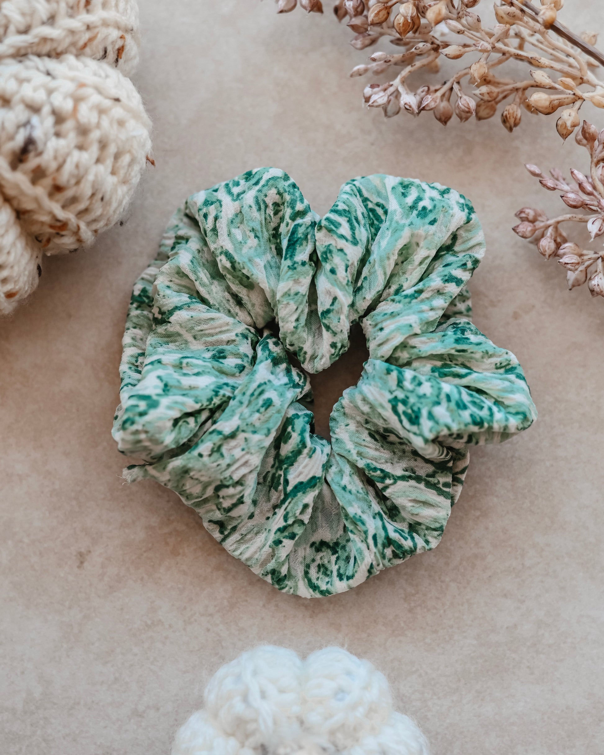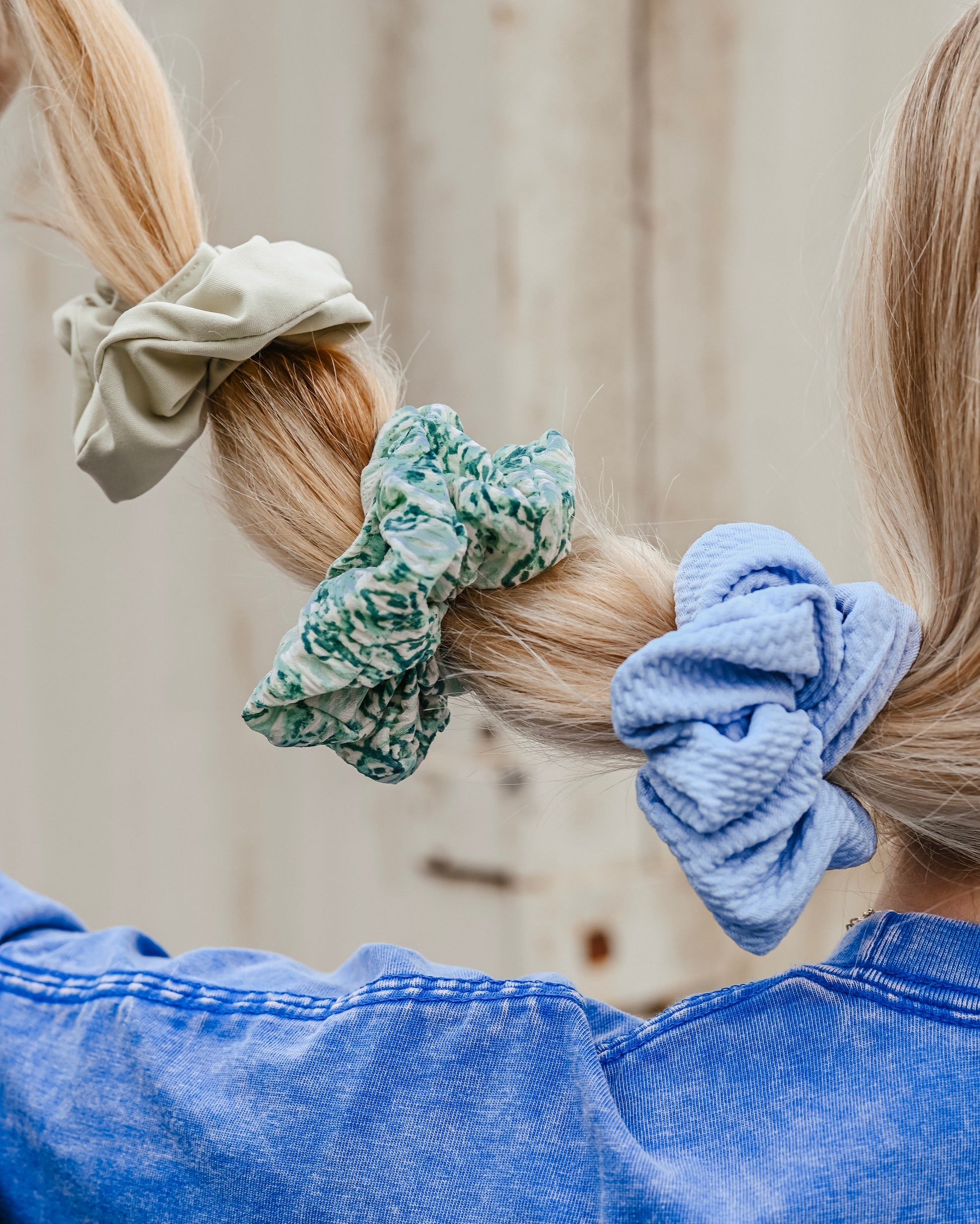 With soft sage green, textured periwinkle, and intricate multi-green patterns, this trio offers versatile options for any occasion. Crafted for comfort and durability, these scrunchies hold your hair securely without tugging.