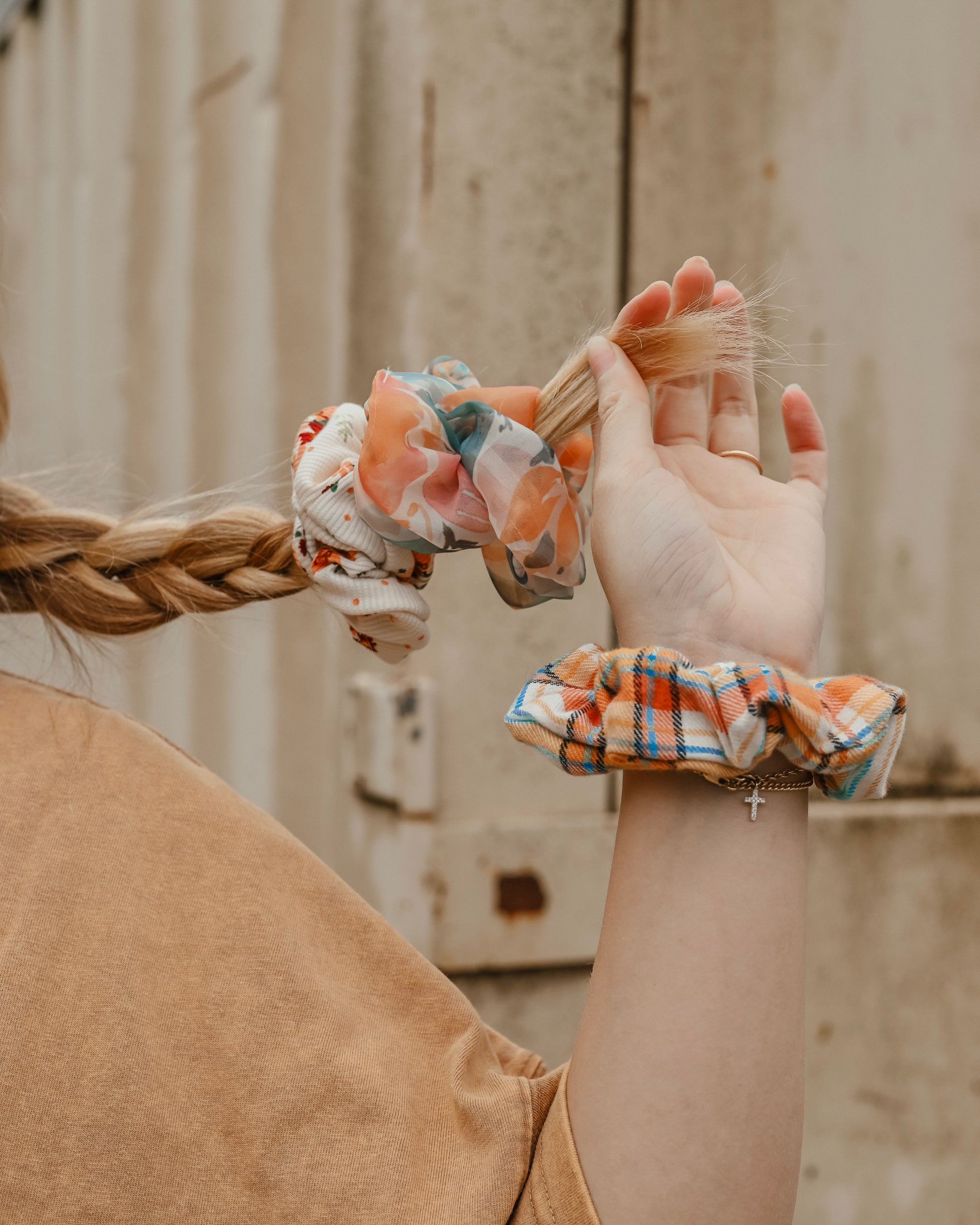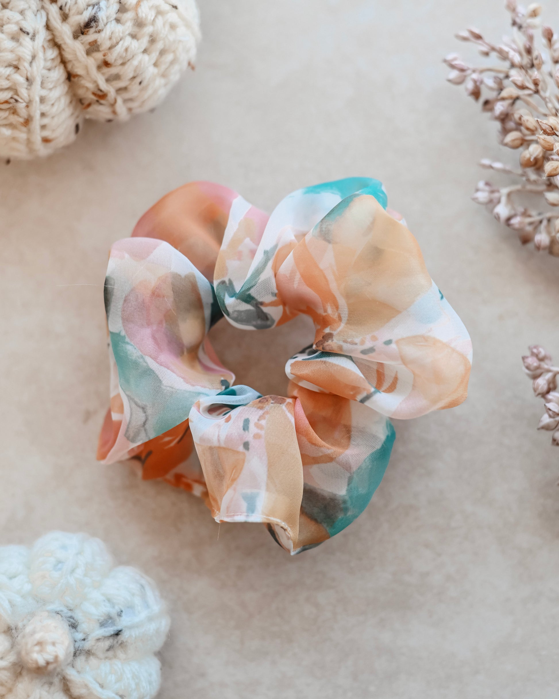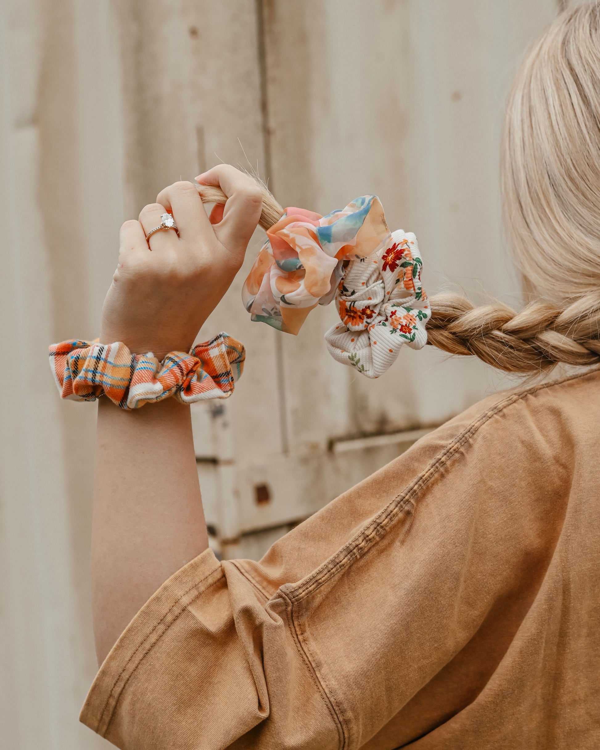 This trio showcases a delightful array of fabrics to elevate your hair game. The first scrunchie boasts a lightweight material with a bright watercolor look, adding an artistic and whimsical touch to your hairstyle. The next features cozy flannel fabric with pops of orange and blue, invoking a warm and rustic vibe. The final scrunchie is a white wonder adorned with orange and red flowers, green leaves, and charming orange polka dots, bringing a touch of floral elegance to your ensemble.