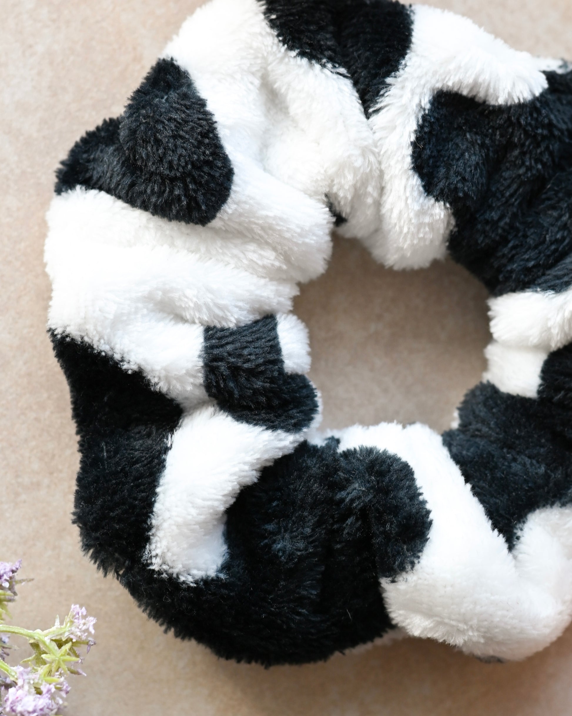 Regular sized extra fluffy cow print micro-fiber material scrunchie. Extra gentle on hair and great from drying hair when it’s wet.