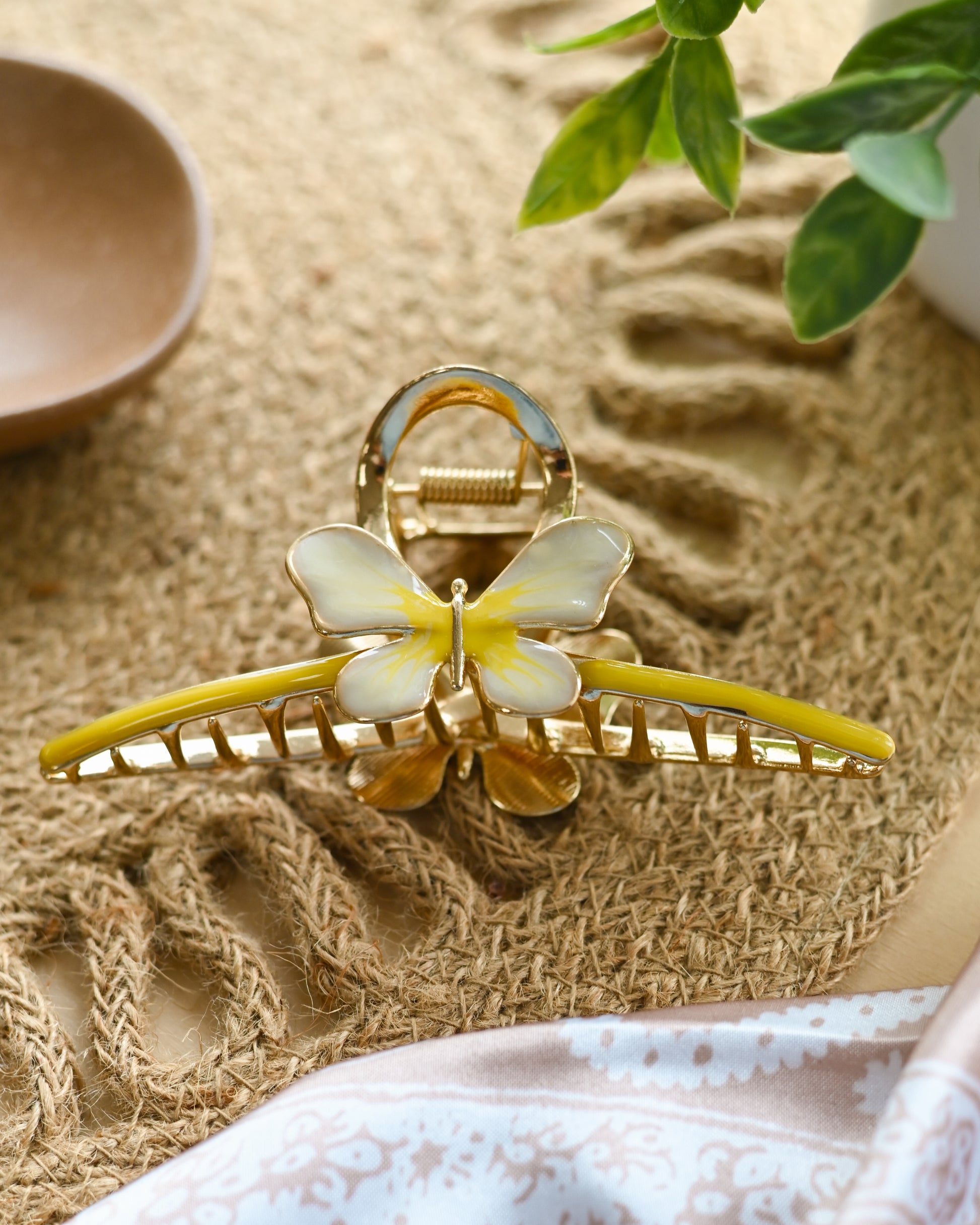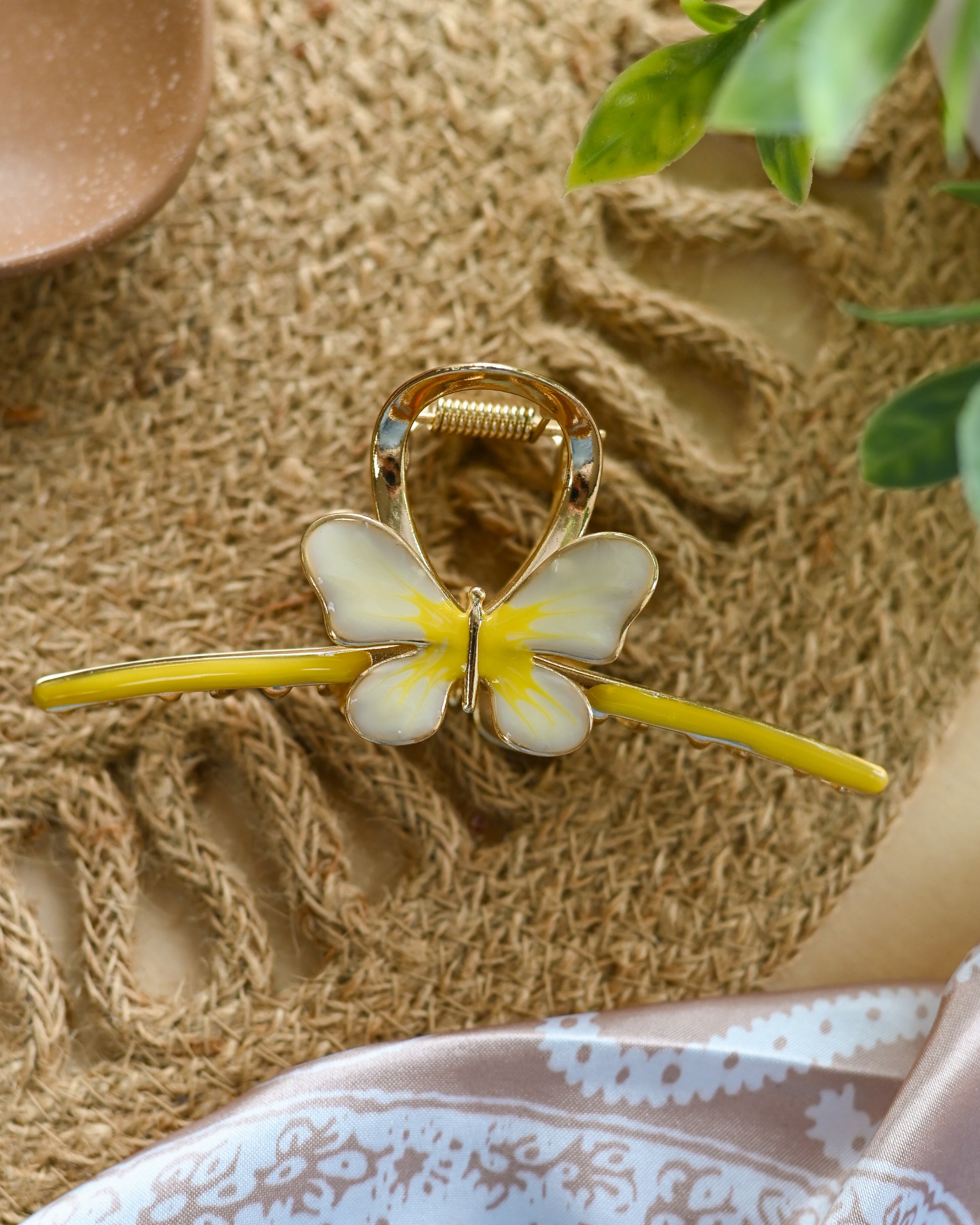 Get the perfect fluttery finish for your look with this rebus-style claw! Twisted metal in a claw shape holds onto a beautiful yellow butterfly, for a totally unique way to style your hair. Add some unexpected whimsy to your style and flutter away!
