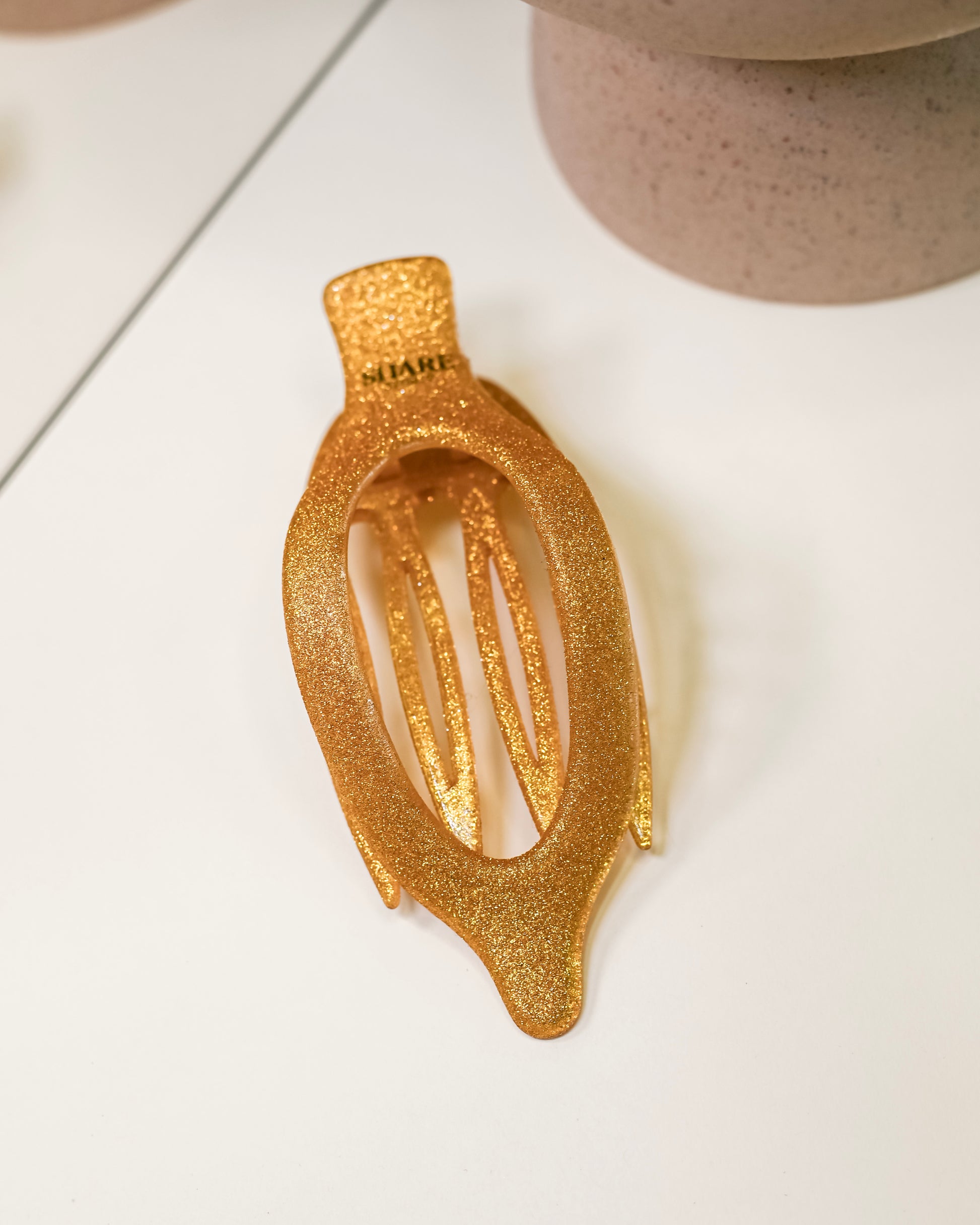 The Lay Flat Wide Clip is a fantastic clip for those seeking comfort, style and efficiency. This clip is best for driving, laying down and just overall relaxing due to its flat-laying nature. Say goodbye to your clip’s teeth digging into your head! Despite this clip’s purpose being for laying flat, the Lay Flat Wide Clip will also perform very well for day-to-day activities for the range of thin to thick hair. For those with ultra long or ultra thick hair, this clip will look and perform wonderfully with a half-up half-down hairstyle. Our Gold Glitter Lay Flat Wide Clip is a true gold color with glitter flakes all throughout and a sparkly finish.