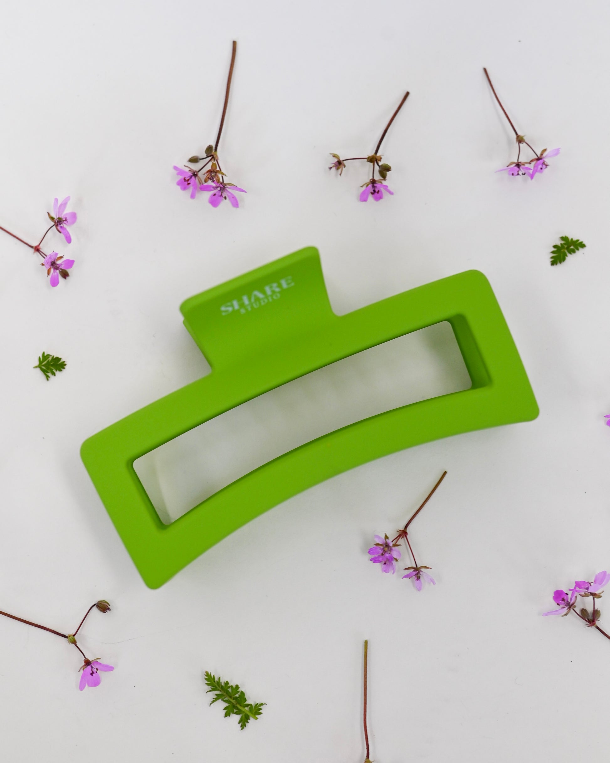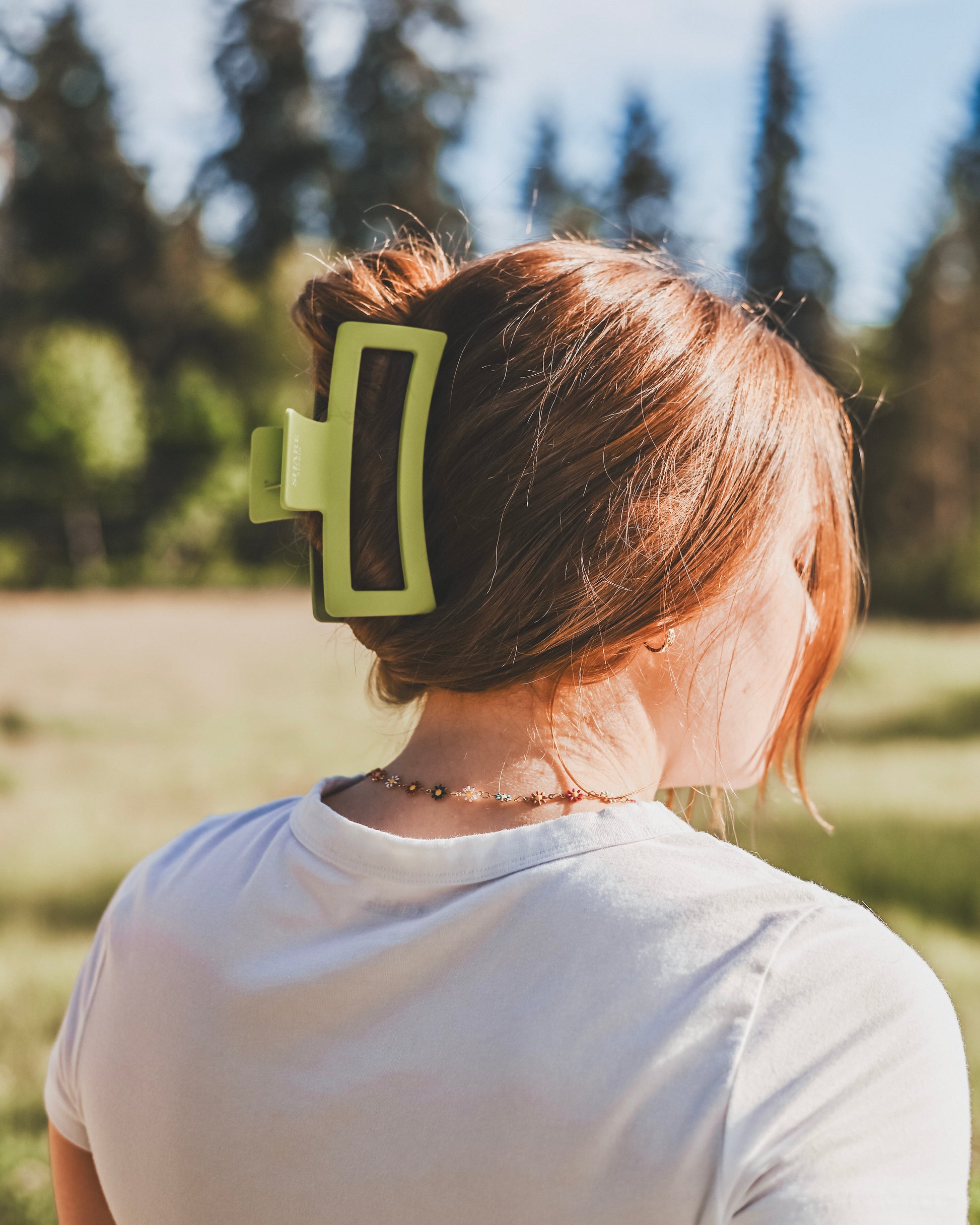 Our infamous Jumbo Claw Clip in a brand new color! This bright matte, lime green color is the perfect shade to brighten up your look this summer. This clip is perfect for thick hair, measuring approximately 5 inches long with an extra strong spring to ensure a lasting grip for all of your luscious locks!