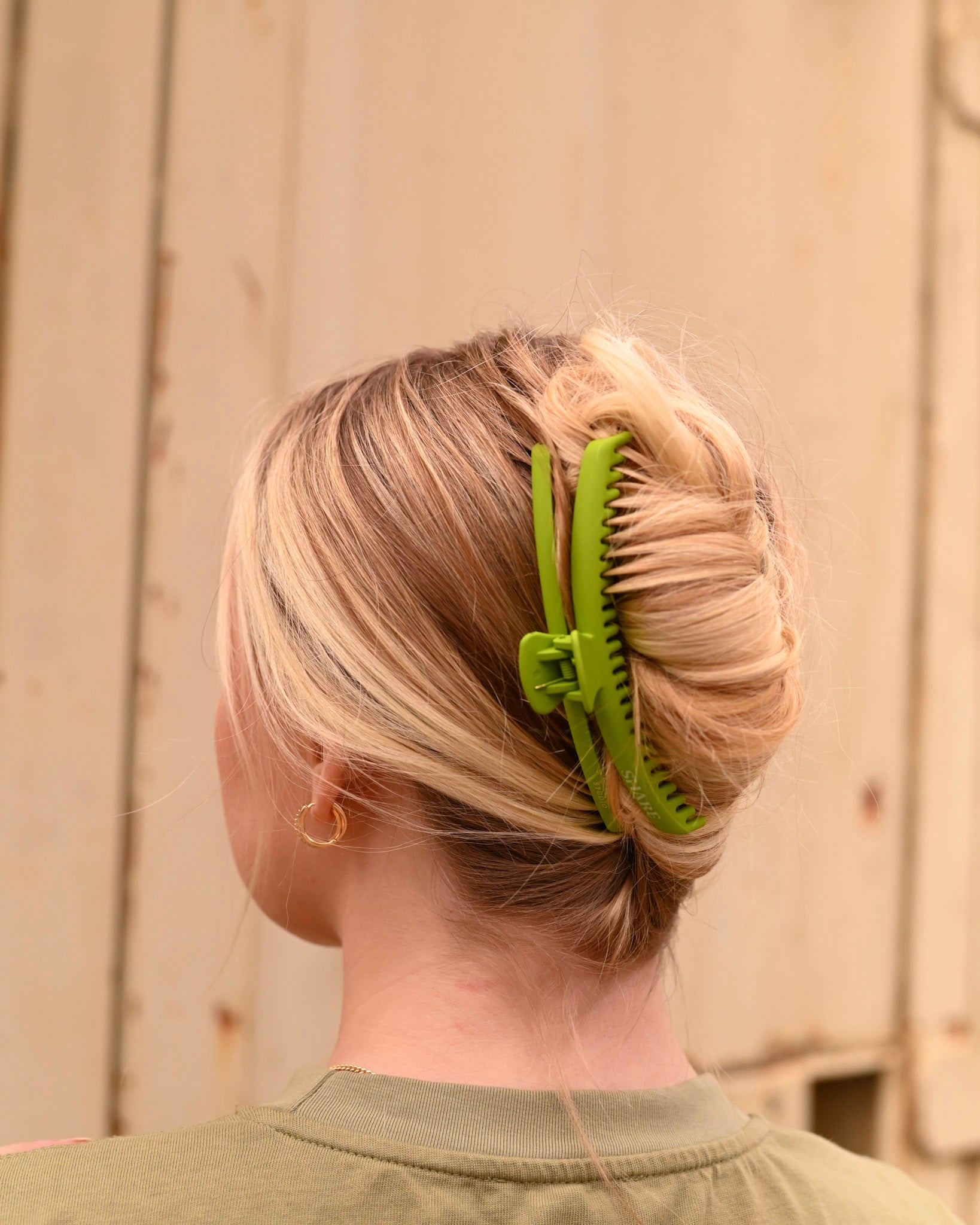 The Mega Hold Clip is a great go-to clip for every hair type, and works wonders at keeping hair in place all day long without causing damage. The structure and design of the Mega Hold allows for a comfortable fit through any activity, including laying down and driving! This clip is especially great for active occupations and hobbies. Our True Green Mega Hold is a vibrant green color with a matte finish.