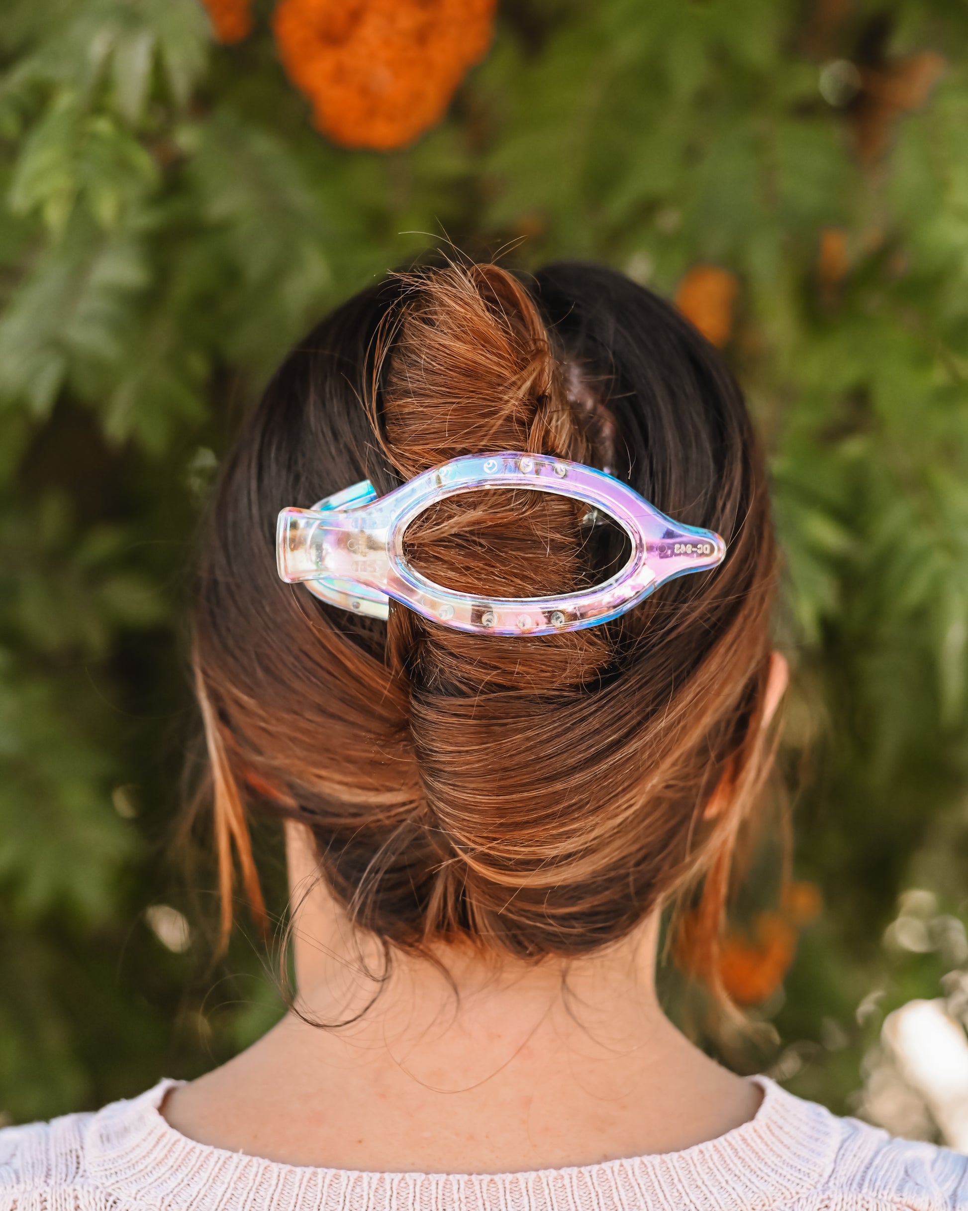 The Lay Flat Wide Clip is a fantastic clip for those seeking comfort, style and efficiency. This clip is best for driving, laying down and just overall relaxing due to its flat-laying nature. Say goodbye to your clip’s teeth digging into your head! Despite this clip’s purpose being for laying flat, the Lay Flat Wide Clip will also perform very well for day-to-day activities for the range of thin to thick hair. For those with ultra long or ultra thick hair, this clip will look and perform wonderfully with a half-up half-down hairstyle. Our Iridescent Holographic Lay Flat Wide Clip is a clear base with an iridescent rainbow coloring and a glossy finish.