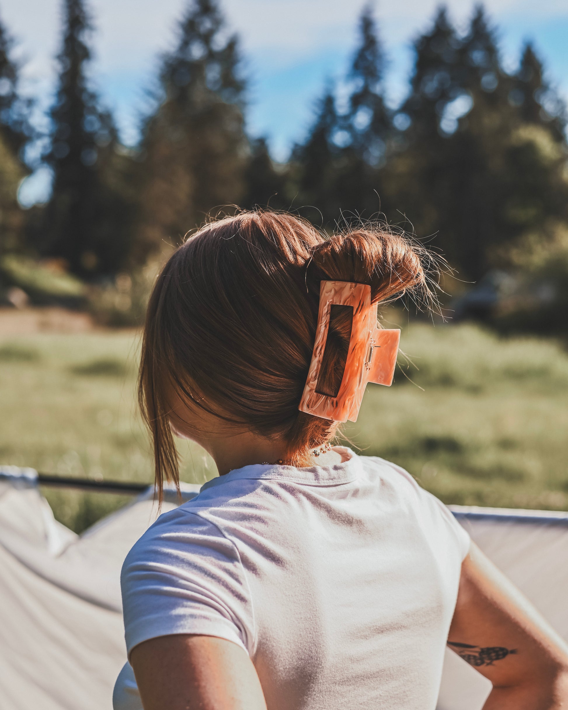 This clip has us just peachy, it's so stunning! Find comfort in our infamous jumbo acetate claw in a new gorgeous color pattern. Approximately 6 inches in length with ample areal room for hair, this clip is designed for the girlies with thick hair. Not only is this clip adorable, it's practical too! Featuring our cellulose acetate material, this clip is eco-friendly and much more durable than any plastic clip in your collection.