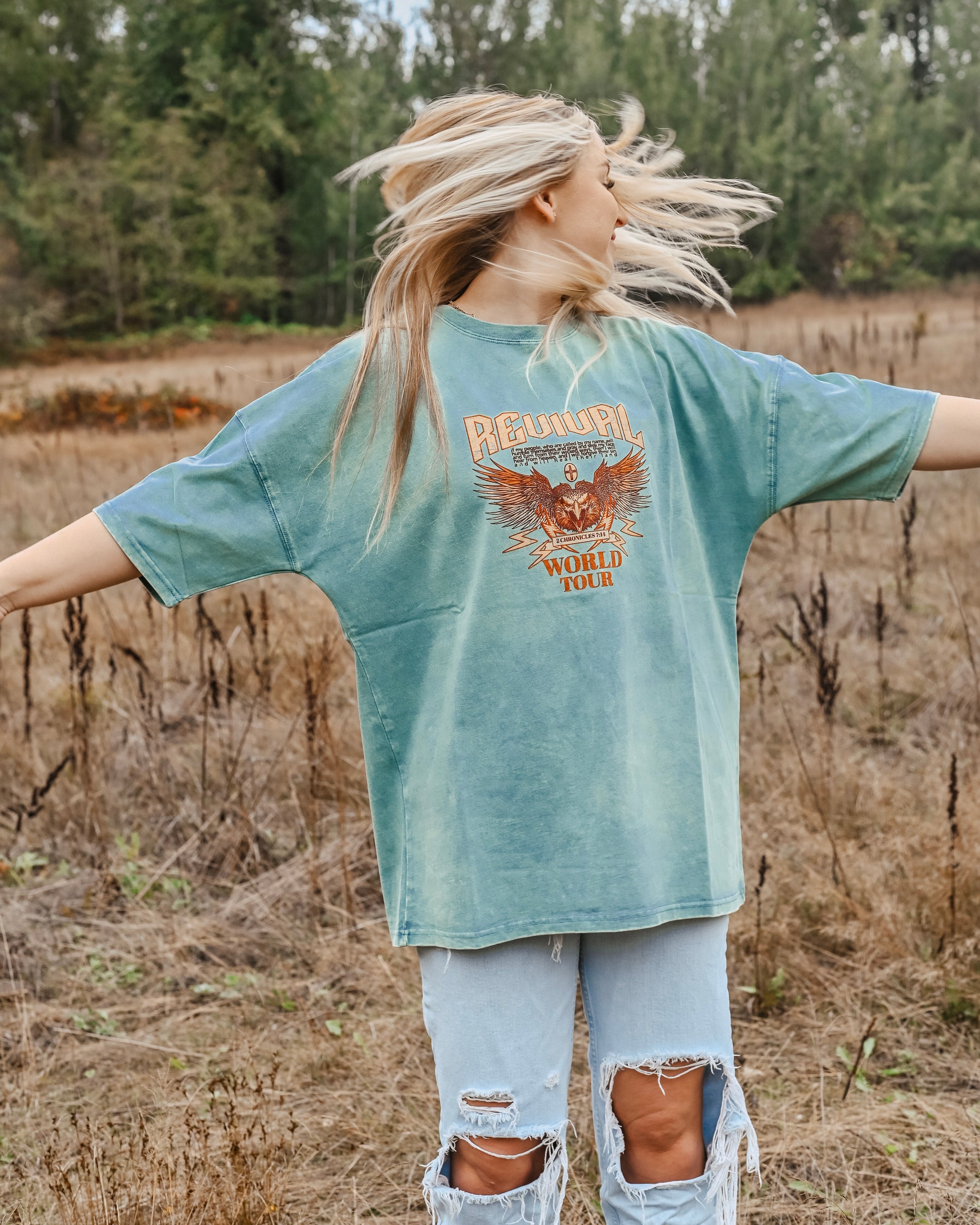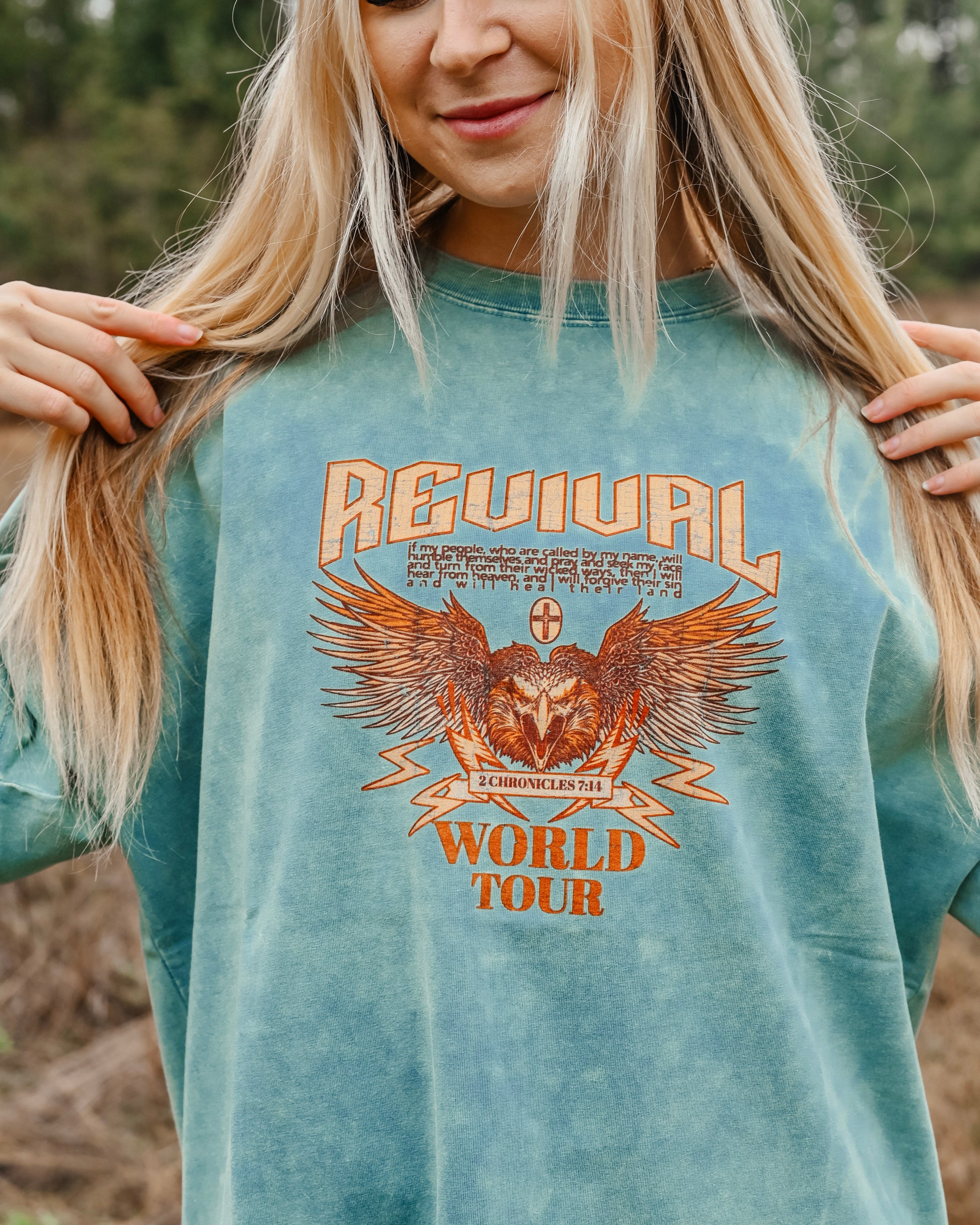 With a classic, vintage appearance and the Revival "World Tour" graphic, this tee exudes a statement of faith, making it the perfect addition to your wardrobe!