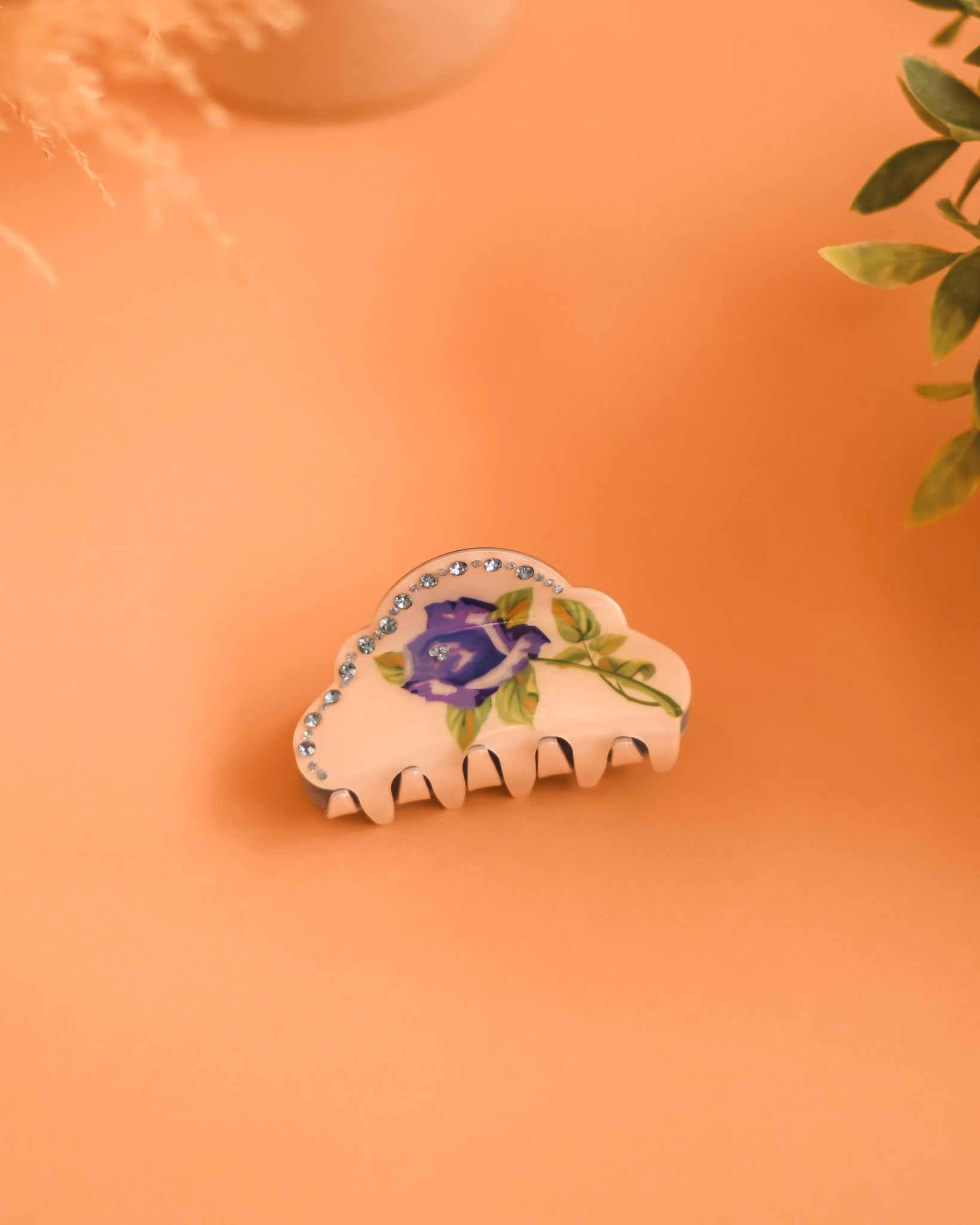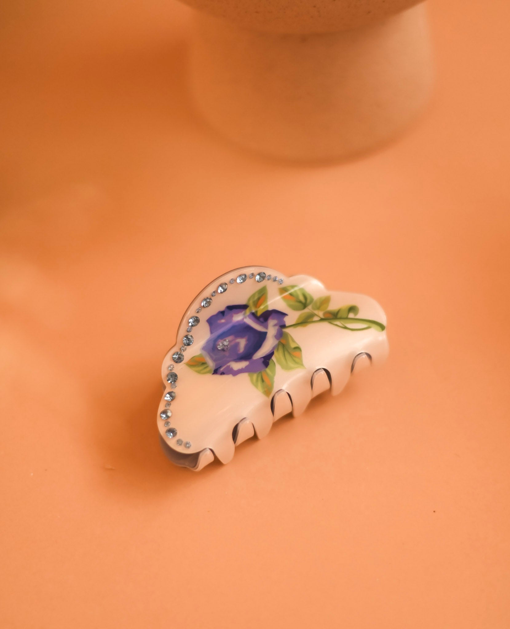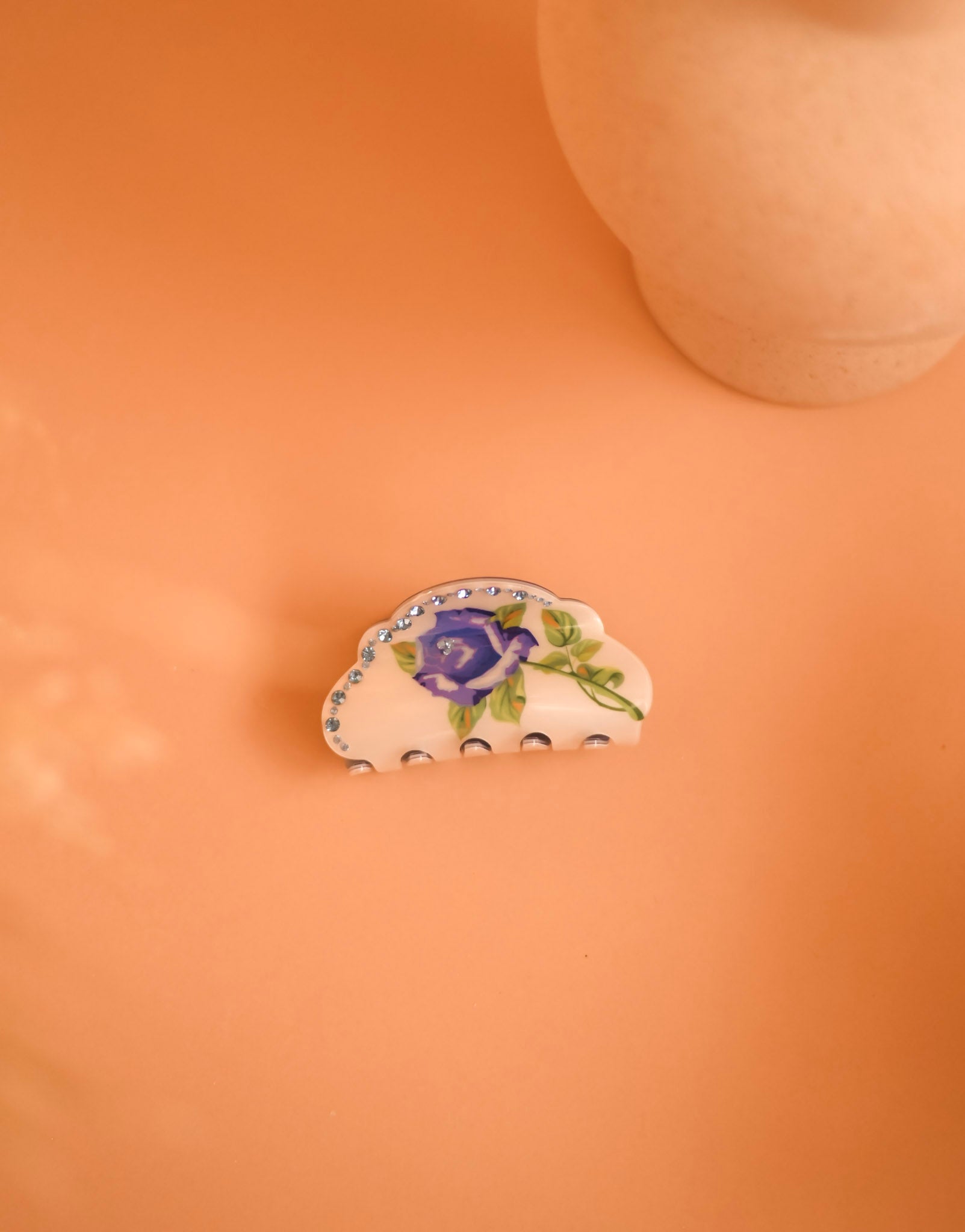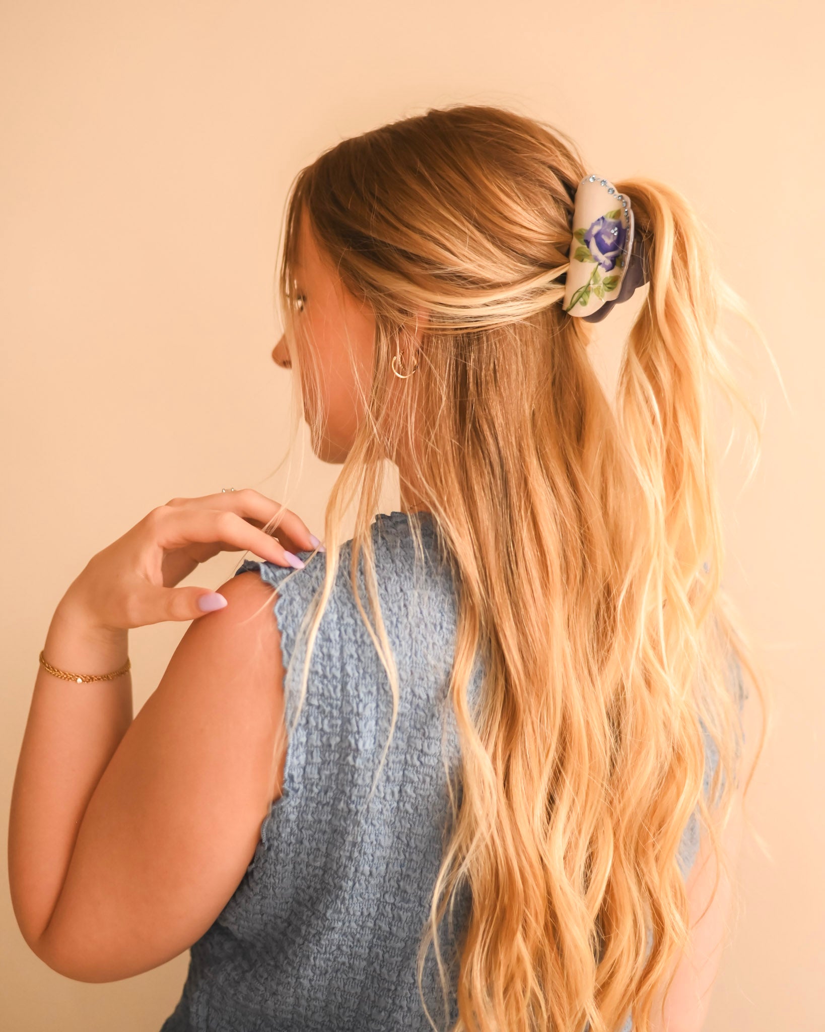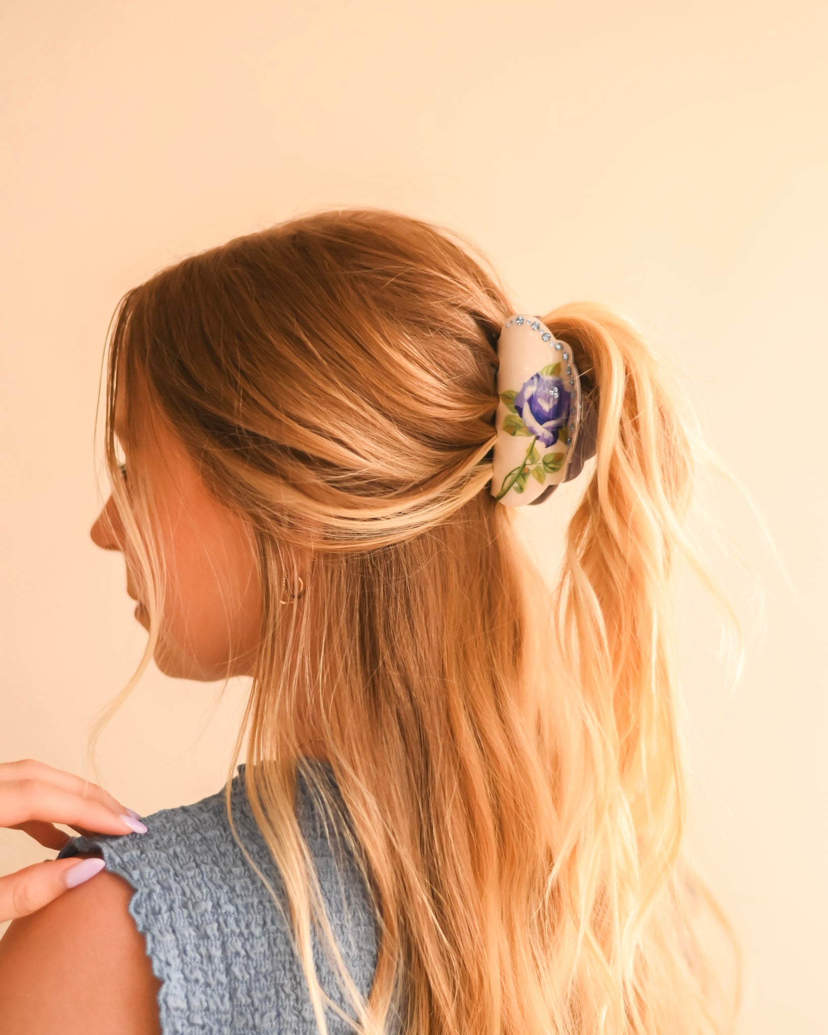 Our Royal Rose Claw Clip is approximately three inches long with interlocking teeth for a strong, quality hold. We recommend this claw clip for those with thin to medium thickness hair, or as a half-up half-down accessory for those with thick to ultra thick hair.