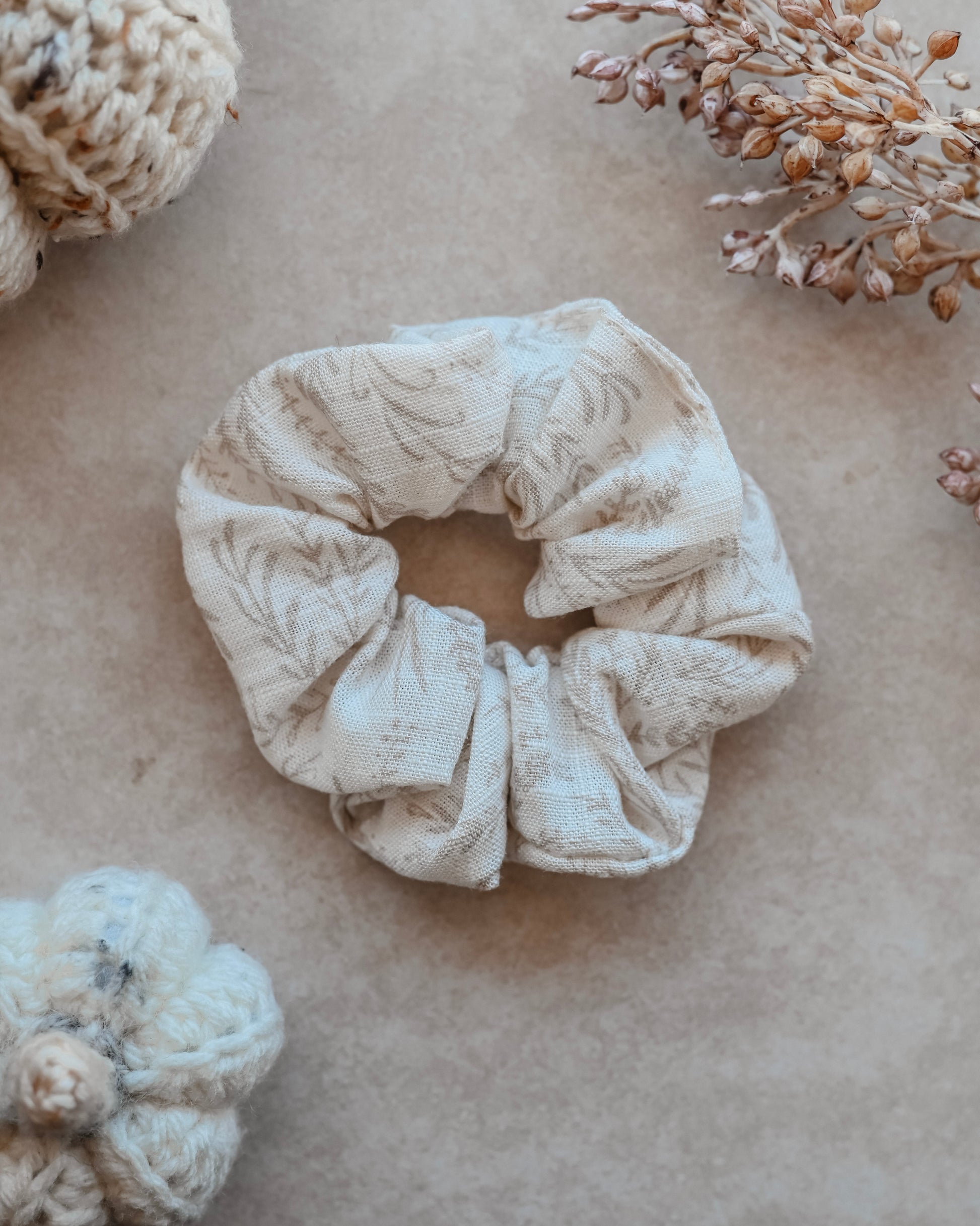 The perfect spring cream linen scrunchies with a delicate taupe brush print.