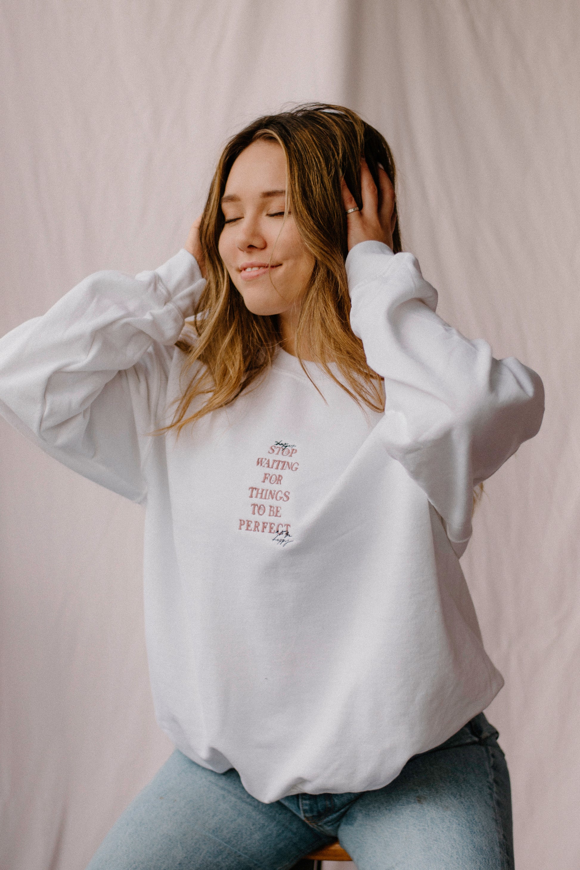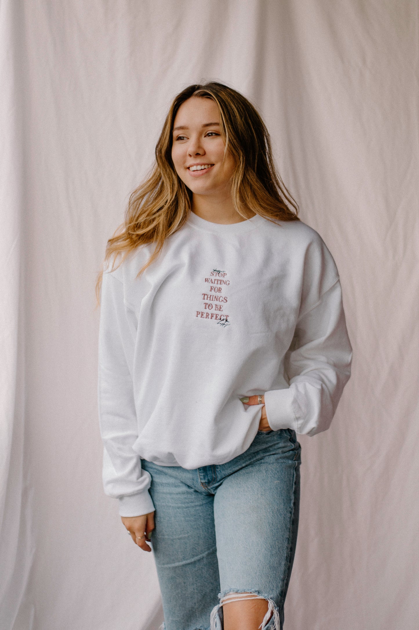 “Hey girl, stop waiting for things to be perfect to be happy” in house embroidered white crew neck sweatshirt.