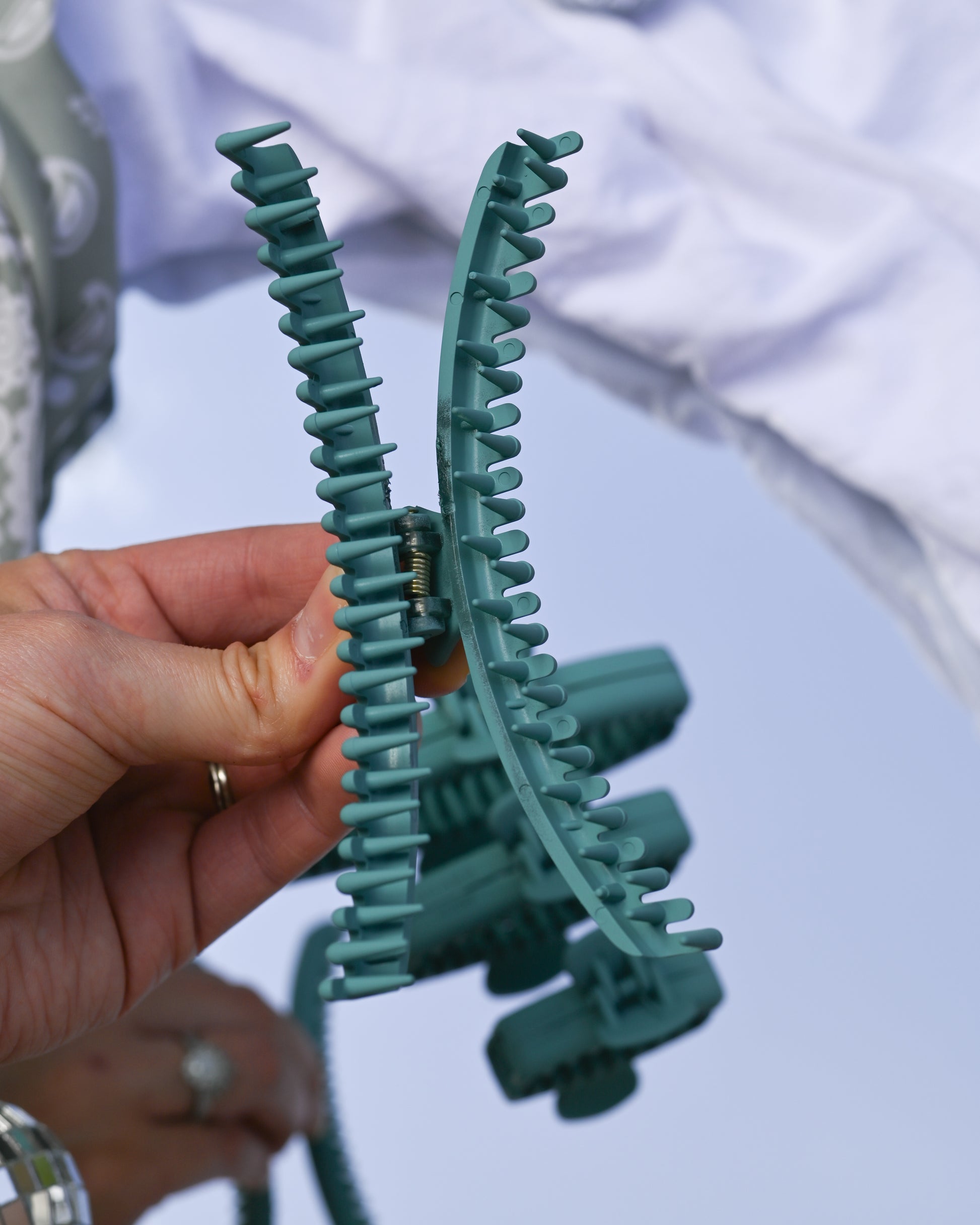 The Mega Hold Clip is a great go-to clip for every hair type, and works wonders at keeping hair in place all day long without causing damage. The structure and design of the Mega Hold allows for a comfortable fit through any activity, including laying down and driving! This clip is especially great for active occupations and hobbies. Our Turquoise Mega Hold is a matte texture.
