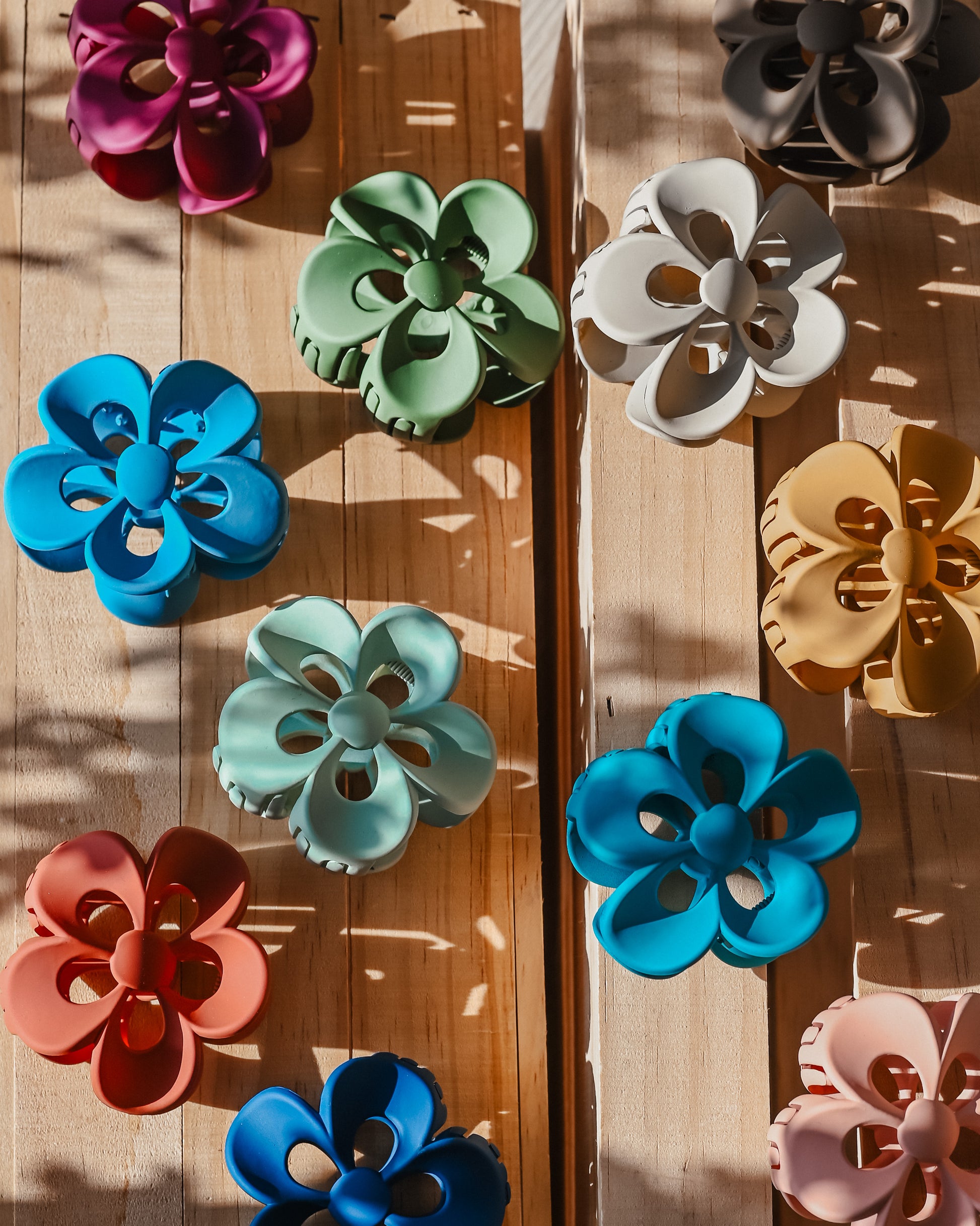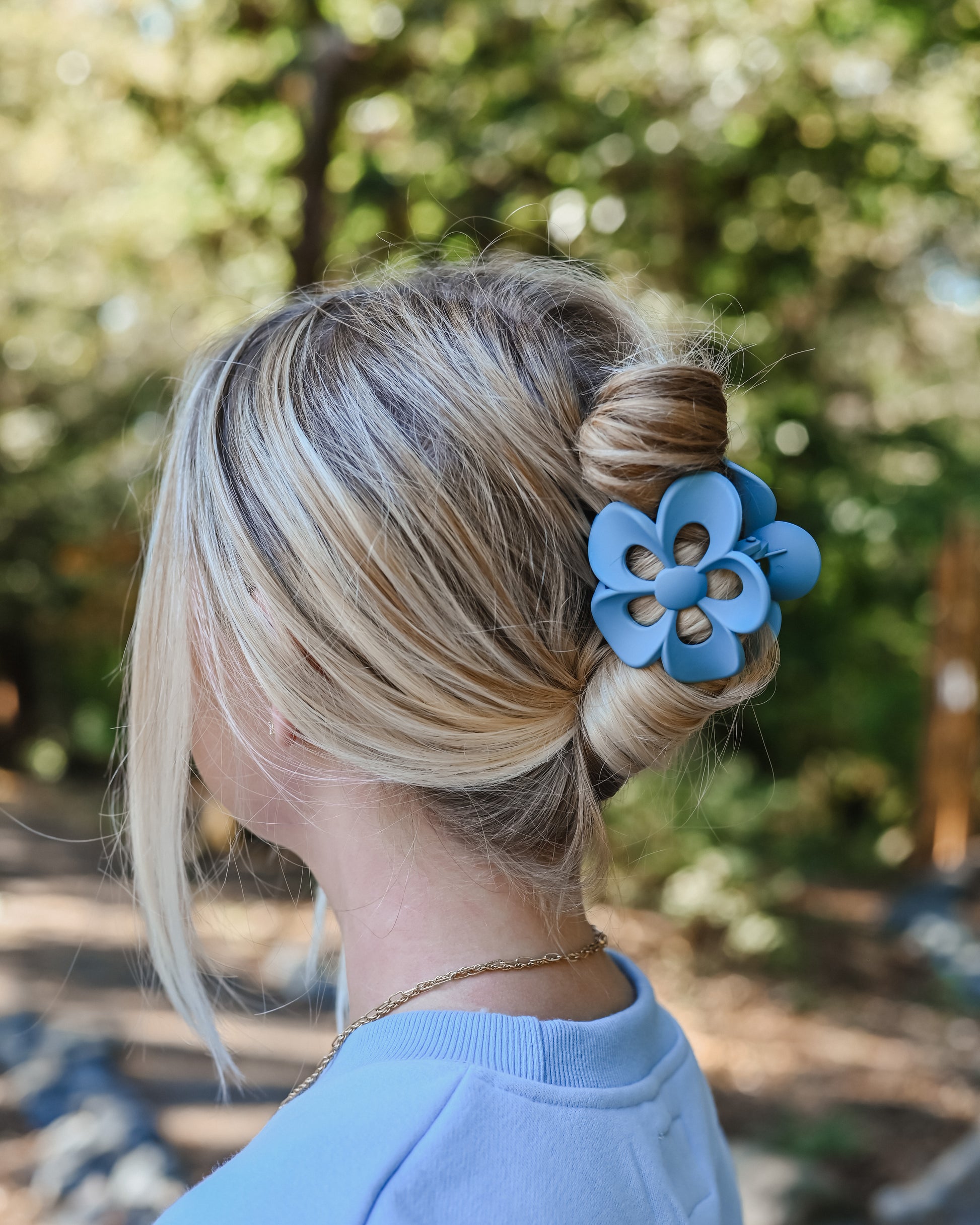 A little twist on the basic flower claw clip. These clips have such a strong hold in the hair for a style that won’t budge all day.