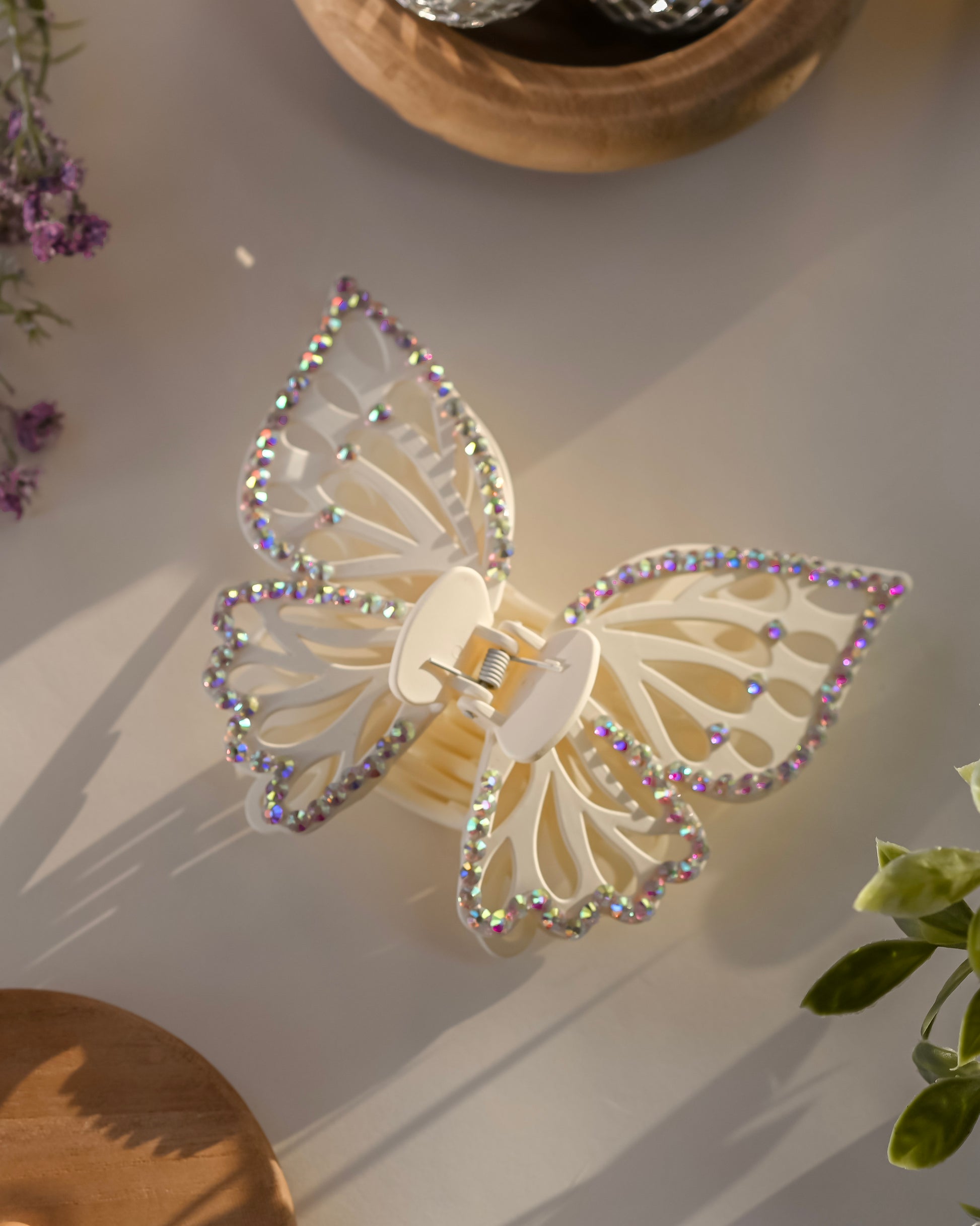 Our infamous jumbo butterfly claw clip, with a gorgeous twist! Outlined with beautiful rhinestones, this clip will take your hairstyle to the next level.